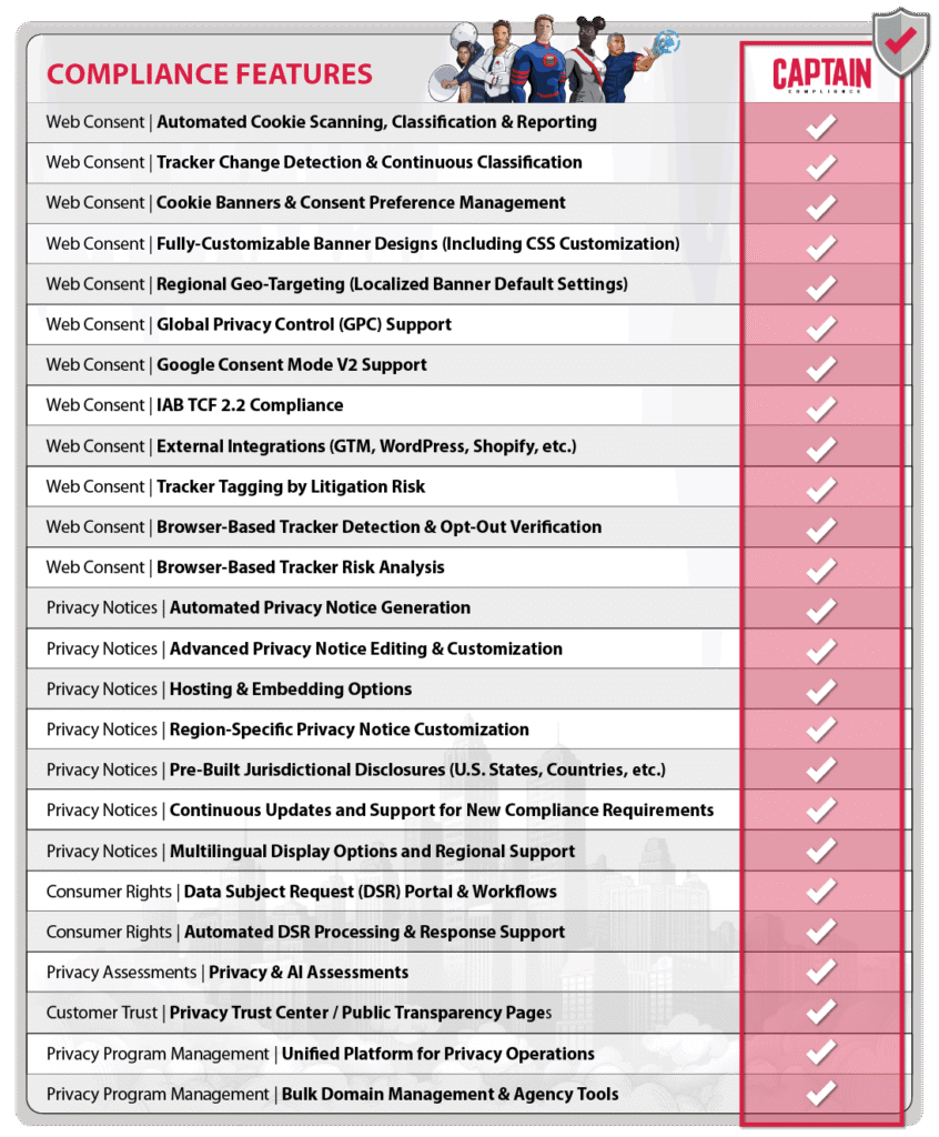 • Access to all Captain Compliance Privacy Modules